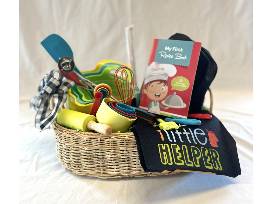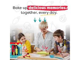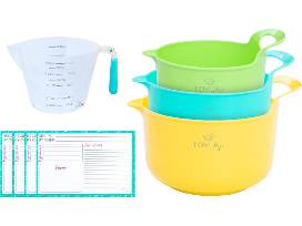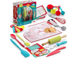 Help unleash your kid's culinary talents with a cooking set that includes 3 mixing bowls, 1 pitcher with measurements, nylon knife, tiny whisk, rolling pin, metal scooper, offset spatula, baking mat, measuring tools, chef's hat and apron, and recipe book. Everything to ensure a fun and safe experience in the kitchen.