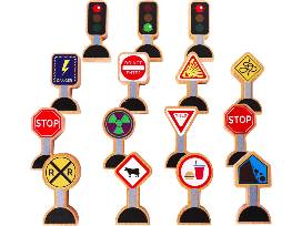They can also learn and enforce the rules of the road with the 15-piece mini wooden traffic signs.