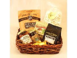 Basket features Zia Tortilla Nixtamal Tortilla Chips, Amy Lasley's Spicy Rocky Mountain Salsa, Halladay's Harvest Barn BLT Dip Mix, Lockhart Honey Farms Pure Colorado Honey, Patsy's Popcorn, Hold Fast Coffee Co. Plum Dark Chocolate Cherry Ground Coffee, and Enstrom Almond Toffee.