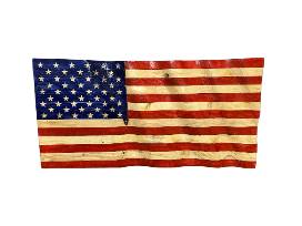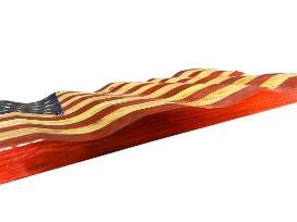 Stars and stripes forever! This handcrafted wooden American flag, with its intricate ripples and vibrant red, white, and blue colors, is a unique and captivating work of art. The rich wood tones and beautiful craftmanship make this flag a truly special piece. Don't miss your chance to own it! Bid now!