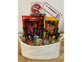 Bonus: Spicin Food Basket including 17 sauces and salsas, with the Pain is Good Hot Sauce 3-pack and the latest Chiefs 3-packs (Arrowhead Smoke, BBQ Sauce, 142.2 Hot Sauce, and the 'Fight for Your Bite' Wing Sauce).