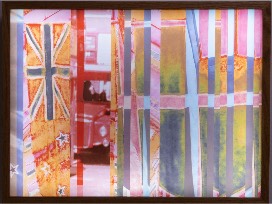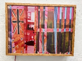 London Flag, panel 3 of 3 is an illuminated art piece created from a series of 35mm slides of an open air market in London in the mid-1950's. Compressing space and time, Lisa Marie digitized and manipulated the slides into a new, colorful configuration, emphasizing iconic elements from the urban landscape as well as the many flags on display. The illuminated art panel was custom built out of red oak that is stained with natural wood finish.