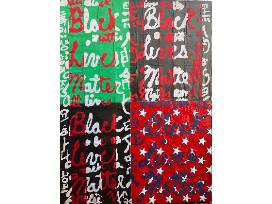 This painting is the eighth in a series of ten, each using actual flags as the canvas. The inspiration struck one morning when I envisioned creating a portrait of George Floyd on a U.S. flag. However, unsure about tackling the portrait, I turned to calligraphy as an expressive medium instead. The piece is rendered in Pan-African colors, with both Chinese and Korean calligraphy intricately woven throughout, expressing a powerful call for "liberty and justice for all." The 10th painting in the series features a portrait of George Floyd on a Bicentennial flag, discovered discarded in Philadelphia's Brewery Town, adding a poignant layer of meaning to the work.