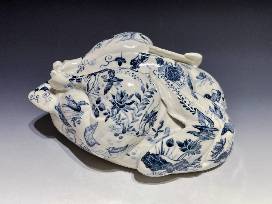 This porcelain sculpture explores the interplay between form, tradition, and narrative. Inspired by classical blue-and-white ceramics, the piece is adorned with intricate hand-painted motifs of flora and fauna, evoking a sense of history and craftsmanship.