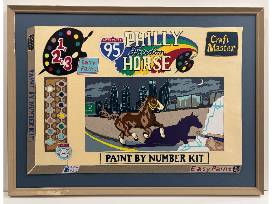 On February 20th, 2024, a horse escaped from a riding club in Strawberry Mansion and was later apprehended at the Allegheny Ave exit of Interstate 95 in Port Richmond. This runaway horse, which was seen by early morning traffic on the interstate, is the perfect subject matter for an inspiring equestrian scene as often depicted in classic paint by number kits. The artwork using hand cut paper collage recreates the packaging of a mid-century craft painting kit depicting the improbable run of the horse known as "Freeway" with the Philadelphia skyline as backdrop.