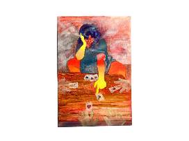 This piece focuses on a warm and hazy environment, a bar-like setting. The figure is engulfed in a tray of smoke adding to the intensity of the situation at hand: spades. All parties playing the game seem to have winning cards and evidently somebody if not everyone is cheating. I chose to add a humorous touch to this painting to remind myself that sometimes things aren't that serious. I tend create environments that you can partially recognize but when looking closer, nothing is rooted in reality. My purpose is never to be too close to what's real, mostly an illusion but never the real thing.