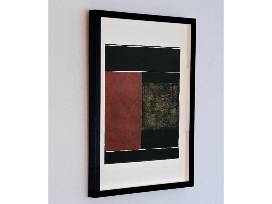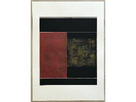 The vertical and horizontal divisions recall the structure of traditional Japanese interiors, where sliding panels and wooden frameworks define spatial relationships. The restrained color palette-deep blacks, warm reds, and earthy tones-evokes the natural materials and atmospheric depth of the space. Layers of pigment create a tactile surface, referencing both the aged patina of the villa and the organic interaction of light and shadow within its walls.