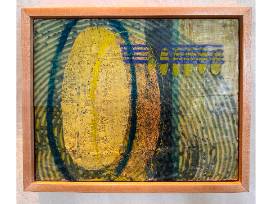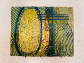One of my few encaustic works, Orb continues my exploration of layering, this time with pigments, wax, and sheer printed organza. I'm drawn to the interplay of opacity and translucency, as well as the textural possibilities of the surface. The addition of metallic pigment adds a compelling dimension, and working with colored wax to build the image was an exciting process.