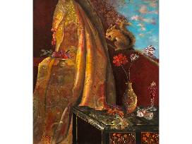 This painting is a transitional work which navigates between the earlier smaller "Correspondence" pieces and my latest work. Both the Correspondence paintings and the new Natural Philosophy paintings are based on a grid. Cloth of Gold takes the themes of echoing forms in nature and in human-made objects, both in paintings and in decorative objects from the Correspondence works. However it plays on a composition derived from late Baroque still life, where the objects of still life are presented in the landscape. The clear reference to tropes from historical painting is a continuing theme in my work. I would say this is one of my least cerebral and most purely sensuous of paintings.