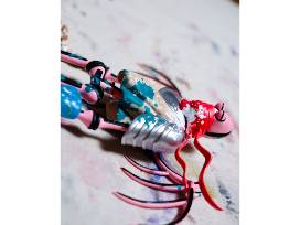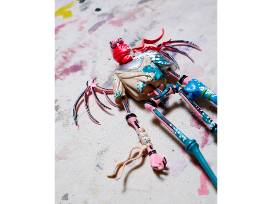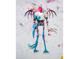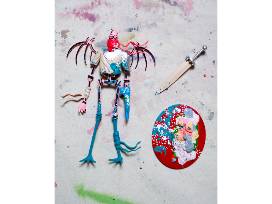 *Skeletal Sculpture V1* is a three-dimensional embodiment of my signature themes: mortality, resilience, and identity. This limited-edition 12-inch work features a winged skeletal warrior rendered in pink and black, outfitted with eclectic armor - including a flowing red scarf and an oversized sword - all characteristics drawn from my visual lexicon developed on city walls. The figure's exposed bones confront the viewer with the reality of mortality, while its defiant stance (wings outstretched and weapon in hand) evokes a sense of resilience in the face of adversity. By stripping the human form down to its skeletal essence, I explore identity beyond surface differences: the skeleton becomes a universal avatar, a reminder that beneath the skin, we share a common framework even as we each imbue it with our own personal and cultural narrative.