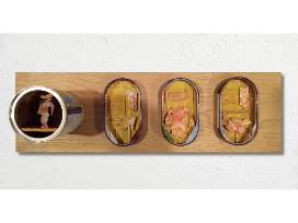 "Canned Couture" is a set from a large collection of pieces that are indeed "canned art" - recycled metal food cans are used by the artist to "host" small scenes, constructed with watercolour, craft paper, and other materials. The pieces use irony (e.g., in the "canned fish" works) and humour, combined with the idea of playing with scale and choices of material, to engage viewers and ask them to think further about how art can appear in many different settings and contexts. One of these pieces was recently published in a French magazine, and the works have proved popular to audiences locally, as well. In "Canned Couture", I am experimenting again with alliterative titles, and also seek to capture - well, to "can" - some interesting aspects of couture or fashion. Here, we have a canned "catwalk" with a model in the latest fashion, as well as a canned shoemaker, dressmaker, and haberdasher: all the ingredients for a successful bit of haute couture... in a can.