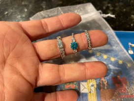 3 beautiful costume jewelry rings (2 medium size and 1 small) on a Fiesta style jewelry plate.