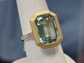 1This elegant ring features a 5.60ct green amethyst center stone set in 18kt yellow gold. Twelve diamonds, totaling 0.27ct, line the band, adding subtle sparkle. The warm gold setting enhances the soft green hue of the amethyst, creating a timeless and sophisticated piece.