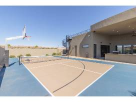 This stunning 5-bedroom, 7-bathroom home is an entertainer's dream, designed for seamless indoor/outdoor living. With 10-foot-tall glass sliding doors opening to a massive covered patio, it offers the perfect flow for gatherings. Enjoy luxury amenities like a fully equipped kitchen, a private heated pool with a slide, a pickleball court with a basketball hoop, and a sky deck with panoramic views of Snow Canyon State Park. Accommodating up to 20 guests, this home is perfect for family trips or large groups. With high-end upgrades, a theater room, Sonos speakers throughout, and ample parking-including an RV garage-this home is your ultimate getaway in St. George.