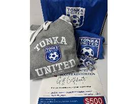 $500 Gift Certificate for use towards program registration for the 2025-26 soccer season. Tonka United Hoodie (Adult Small), Long Sleeve T-shirt (Youth Medium), drawstring bag and trading pin.