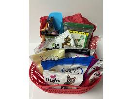 This basket includes a selection of treats, and food items, scoop, pet care supplies and other goodies.