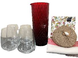 Transform your dining experience with this exquisite package from Olley Court featuring luxurious Libeco Towels and a stunning red Zafferano Pitcher, complete with four matching glasses. Perfect for entertaining or adding a pop of color to your everyday table setting, this collection combines style and functionality.