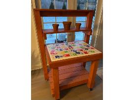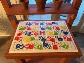 This masterpiece of pint-sized horticulture engineering is an outdoor gardening table that can be used for potting, germinating seedlings, or doing whatever your heart desires for your garden. This table is adorned with tiles that capture each of our Kindergarten boys' hands and names surrounded by an "H" to show our Haverford pride. Built with outdoor-friendly lumber and weather protection, the table includes casters to ensure easy mobility.