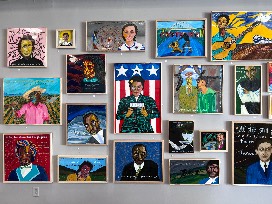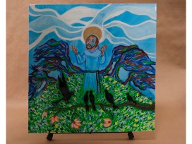 "When things shut down in 2020, I suddenly had more time on my hands at home. I decided to start painting again after a long hiatus. Our son, Caney, a truly gifted painter and artist, taught me a technique to cover my acrylic compositions with resin and hardener, creating a glossy finish, allowing the colors to pop out. And vibrant color is what I love most as a painter. I started by painting and resining a picture of St. Francis. I then decided to paint a series of portraits of justice seekers, poets and visionaries, featuring a quote from each. Becca envisioned the grouping of these paintings as a kind of quilt, covering a wall at the new space for The Center for Contemplative Justice."