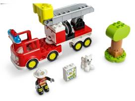 LEGO DUPLO Town Fire Truck 10969 Building Toy Set for Toddlers, Preschool Boys and Girls Ages 2-5 (21 Pieces) This set includes LEGO DUPLO firefighter and cat figures, a tree and a fire engine toy with flashing lights and siren (batteries included) With this fire engine toy, kids of all ages can use the lever to raise the ladder and rotate the basket to save the cat from the tree!