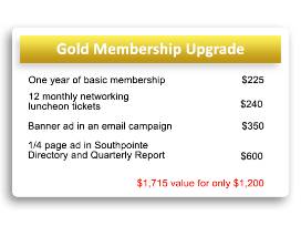 This auction listing is valid for a gold membership. The package includes: one year of basic membership, 12 monthly networking luncheon tickets, banner ad in an email campaign to all chamber members, 1/4 page ad in Southpointe Directory and Quarterly Report !