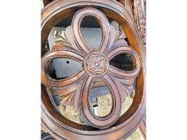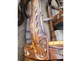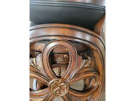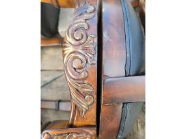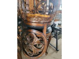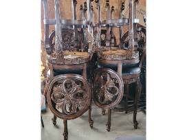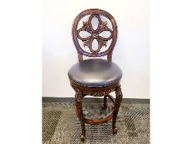 Description: This is a used set of 8 sturdy wooden barstools. They feature navy blue leather-padded seats and are embellished with ornate carvings. Although a few scuffs are present, the barstools are still in excellent condition.