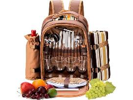 The picnic backpack is large enough to store your foods like fruits, sandwiches, meals, snacks, breads and more. You will get one picnic backapack for 4 with various picnic accessories, including 4 x stainless steel knives, forks and spoons, 4 x cotton napkins, 4 x PS standing cups, 4 x white 9-inch melamine trays, 2 x plastic salt and pepper cans, 1 x stainless steel bottle opener, 1 x stainless steel cream knife, 1 x plastic cutting board and 1 x fleece camping mat (45.2'' x 53.15'').