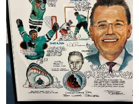 In celebration of Hockey Hall of Famer Dan Rusanowsky receiving the 2023 Foster Hewitt Memorial Award on November 13, 2023, artist Frankie Galasso created a print highlighting iconic moments in Sharks history throughout Dan's time as a Sharks Broadcaster. This piece of art was unveiled during Dan's recognition ceremony at SAP Center on Friday, November 25, 2023.
