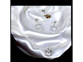 The necklace and earrings are crafted from solid 925 sterling silver and overlaid with white gold to ensure durability and a luxurious finish. The chain measures 18 inches and has a lobster clasp.