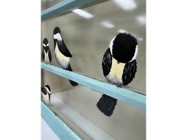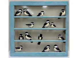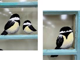 About the piece: When we moved to Canada, one of the first things I remember doing was going for a walk. A couple gave us some birdseed and told us to feed the Chickadees. I fed about 30 chickadees on the first day. Now we feed them all the time, competing over who can feed more. They have become a staple decoration around our house.
