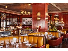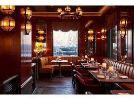 Located on the Seaport's Pier 17, the two-story space by Martin Brudnizki Design Studio offers striking views of the Manhattan waterfront and the Brooklyn Bridge. The ground floor features ample seating indoors and out, a wrap-around bar, and a wood-fired oven. A grand staircase spirals up to a handsome, banquette-filled dining room and open chef's kitchen.
