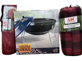 Make camping trips a breeze with everything you need for comfort and convenience. This package includes a 14-inch portable charcoal grill, a deluxe outdoor tent from Amy Miller Lodge Collection, and a down alternative sleeping bag.