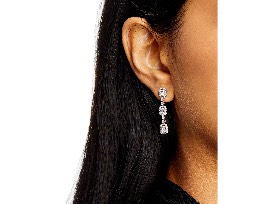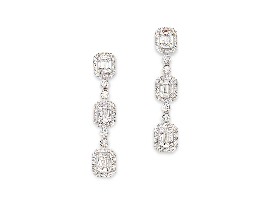 - Trios of halo clusters are set in a linear design on these diamond mosaic drop earrings