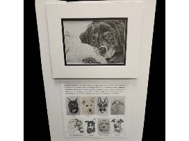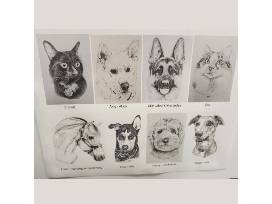 Artist/art therapist Laura Griffin has been drawing animals, birds, and other creatures for over 45 years and is now retired but still donating artwork. Laura takes pride In capturing your pet in an original pen drawing. The above copy of a portrait of service dog Georgia owned by Jess Hagenah, is the size you will receive which is a 5"x7" drawing in an 8"x 10" Matt board each matted drawing is worth $250. Below are more examples of Laura's current artwork.