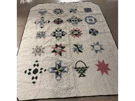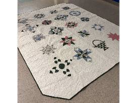 Donated by St. Vincent DePaul, this quilt was created by the Nativity Catholic Church quilt group, who put much care and time (150 hours!) into this beautiful handmade quilt + a vintage rack to display.