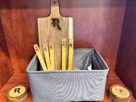 Roncalli custom-made wood cutting board/charcuterie, utensils & coasters.