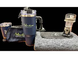 Sustainable Happy Camper Duffle, Mini-Camping Lamp, Picnic Blanket, Anywhere Belt Bag, Stainless Steel Tumbler, Stainless Steel Travel Camping Mug with Cork bottom