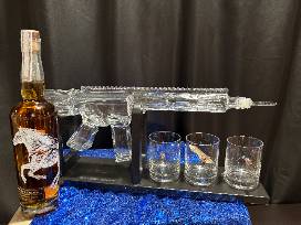 Raise a glass to bold craftsmanship with this striking AR-15 rifle-shaped whiskey decanter, complete with four matching etched glasses and a premium bottle of Chestnut Farms Kentucky Straight Bourbon. This display-worthy set blends novelty with refinement. Perfect for the collector, bourbon connoisseur, or anyone who enjoys a touch of American grit in their home bar.