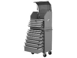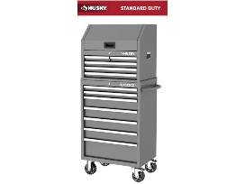 The new Husky 27 in. W Standard Duty Gray Tool Chest Combo is a new addition to the toolbox lineup. This unit is constructed of welded steel and finished with a durable gloss gray powder coat finish. Each drawer is equipped with 100 lb. rated soft-closing slides and a pre-cut liner. The top chest features a tall till with an integrated power strip comprised of 6 outlets and 2 USB ports. The lower cabinet has another 7 drawers and 5 in. x 2 in. casters that allow movement throughout your workspace.