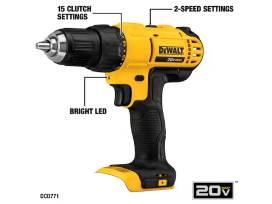 - DCD771 cordless drill/driver has a high-speed transmission that offers 2 speeds (0-RPM to 450 RPM and 1,500 RPM) for a range of fastening and drilling applications