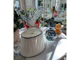 - The Lamp Shoppe: blue and white flat-sided double gourd lamp on acrylic base w/custom pleated shade-$1,600