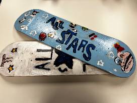 The light blue skateboard including the words "All-Stars" with several emoji characters was designed by All-Stars students Natchigun, Olivia, Abigail, and Kadiatou. The white skateboard with a big blue star, ribbons, and small yellow starts was designed by Nguyen, Tayeba, Alberto, and Jonathan. These students have been working on building and designing these skateboards for weeks for our auction.