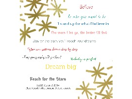 The book contains each child's individual work they created for the class project. Using acrylic paint and sponges they created their very own galaxy. To top it off they splattered white paint to create the effect of tiny twinkling stars. Covering the front and back of the book are the quotes the kids came up with when they worked in small groups to uncover their own inspiration and discover what motivates them to keep reaching for the stars.