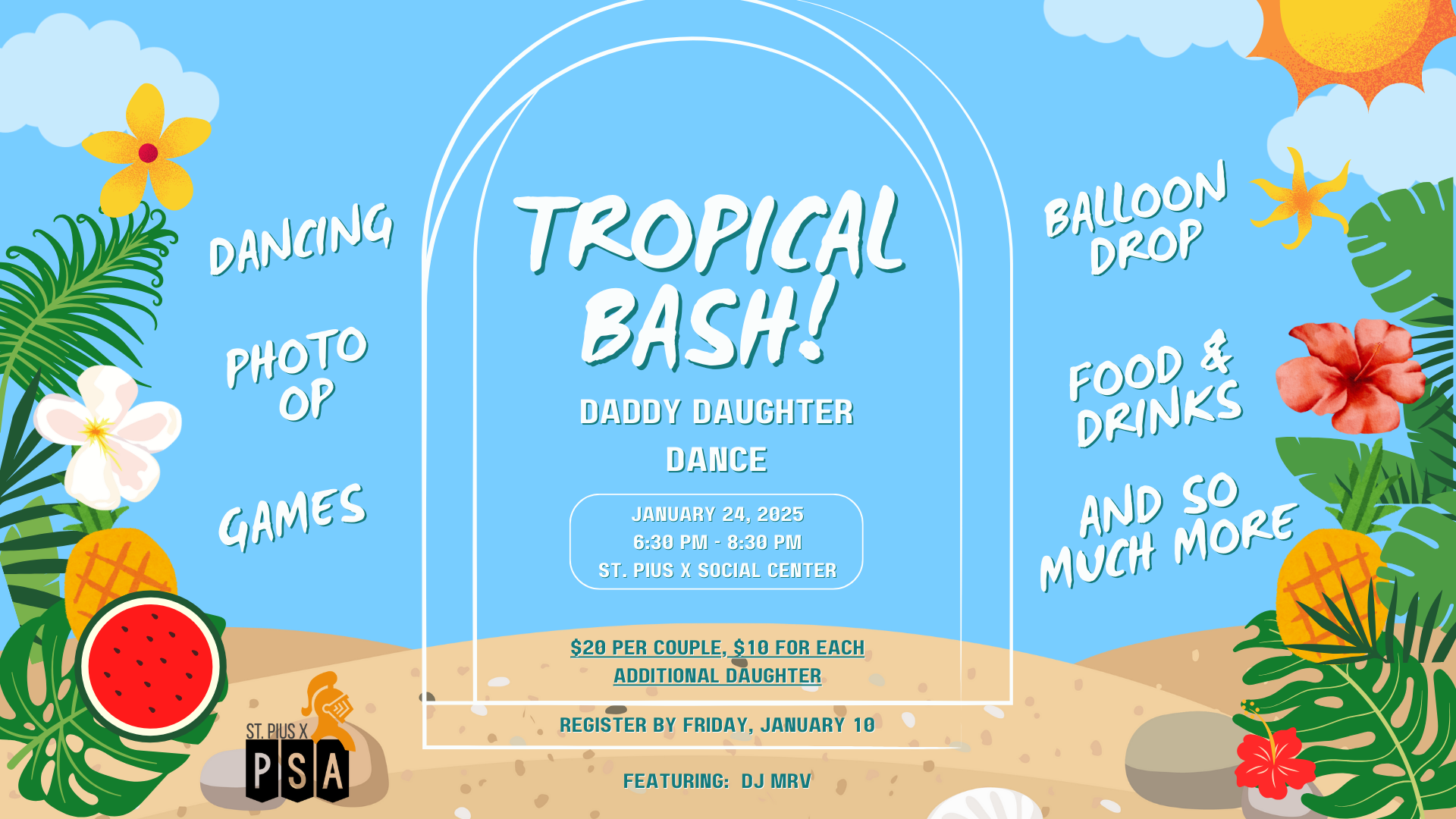 Join us for a Tropical Island Beach Bash! Pull out your tropical island wear and enjoy a night of Father Daughter dancing, snacking, and games!