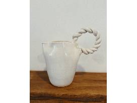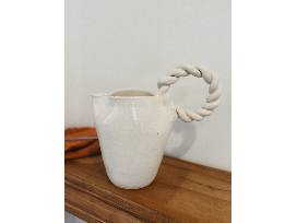 The NUNU Ceramics Rope Pitcher is handcrafted from white stoneware and finished with an eggshell white glaze. Featuring a unique circular braided coil handle, it serves as both a functional and sculptural piece.