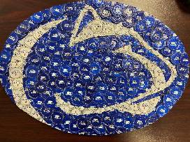 An original Penn State wall hanging made from beer bottlecaps. Created by Mohr Caps, the piece is about 20"w x 14.5"h. A great piece for any Penn State fan's "mancave."