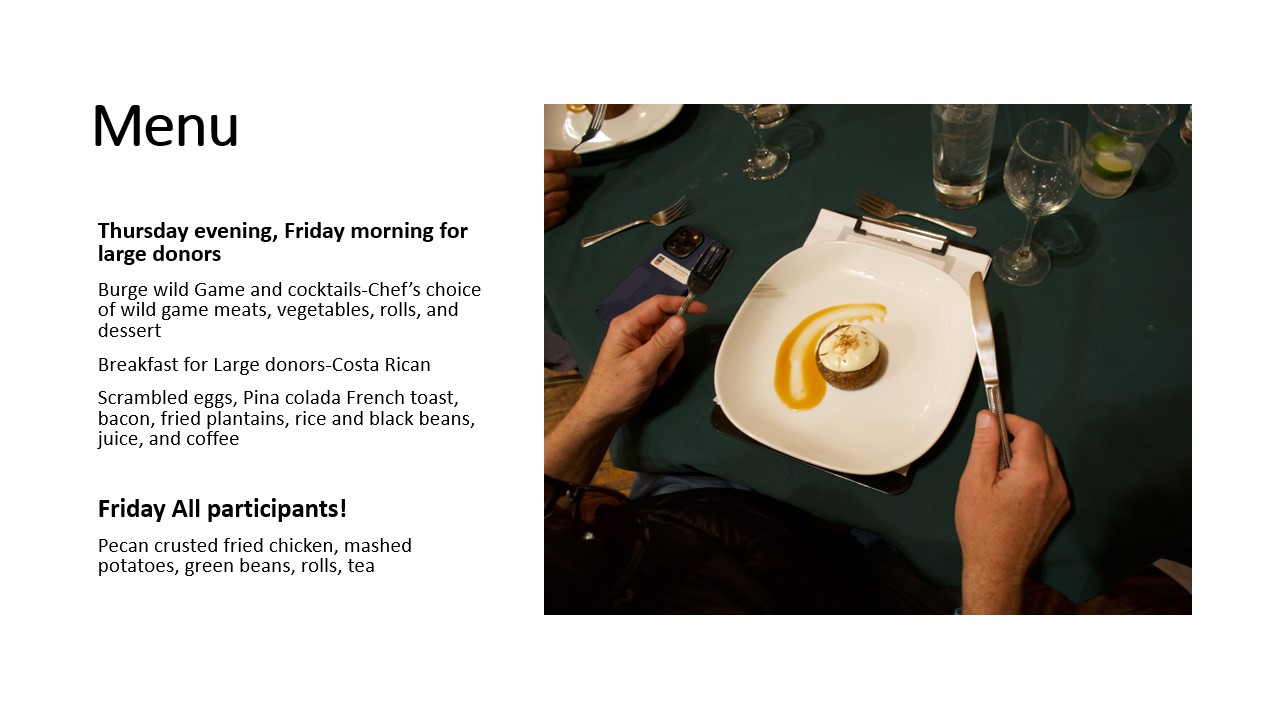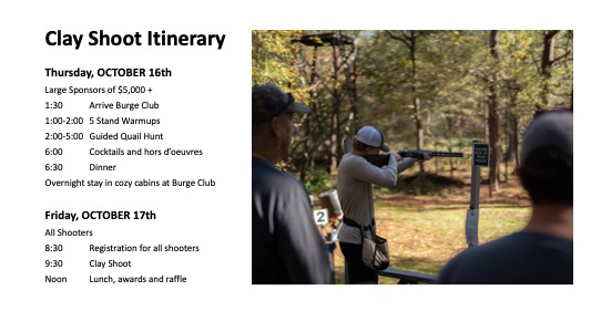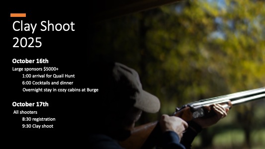 Donors of $5000 or more will begin with a guided quail hunt followed by a delicious Wild Game dinner and tasty cocktails, overnight accommodations at Burge Club, and enjoy a Costa Rican breakfast Friday morning before headed out for the Clay Shoot.