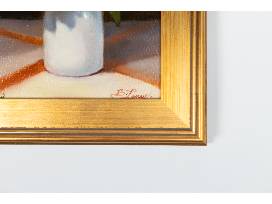 Bring timeless charm and vibrant color into your home with this exquisite original oil still life by Arkansas artist Brenda Laney. Featuring delicate pink roses and hydrangeas arranged in a white vase with colorful planters, this beautifully detailed piece captures the essence of floral beauty in classic form.