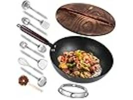 - 12.5 inch Carbon Steel Wok - This classic wok heats up quickly and evenly, making it perfect for stir-frying, sautéing, and tossing your favorite ingredients. Includes 10 accessories, including slotted turner, ladle, spatula, skimmer, solid spoon, slotted spoon, egg whisk, wok brush, wok ring and pasta server