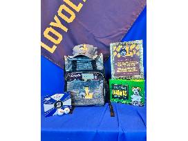 Loyola cooler backpack, scarf, stickers, deck of playing cards, golf balls, hat, flag from Gentile Arena, 4 Tickets to one game of each mens and womens soccer, mens and womens volleyball and mens and womens basketball in the 2025-2026 season, Lagnunitas beer.